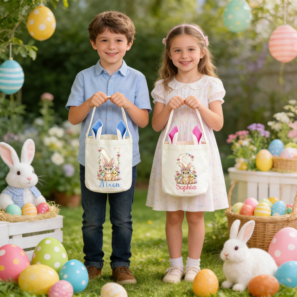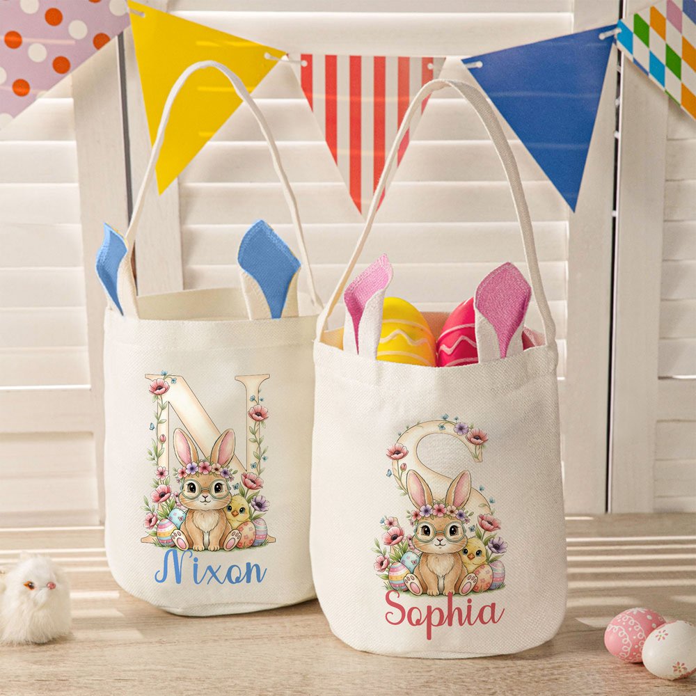 Custom Name Bunny & Floral Alphabet Easter Basket, Cotton Linen Easter Bucket Bag with Bunny Ears, Easter Party Favor, Easter Gift for Kids/Boys/Girls