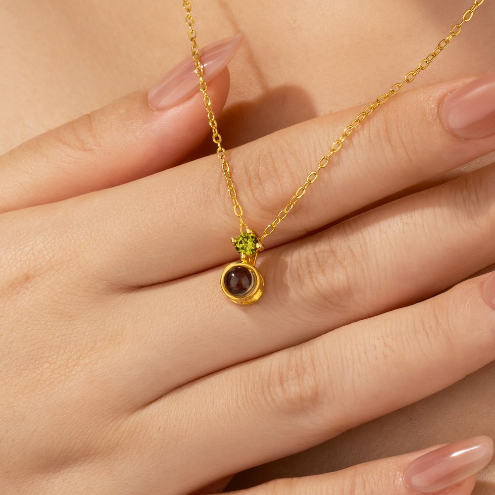 This necklace lets you turn a cherished photo into a wearable memory. Pick a birthstone, select text around the photo (e.g., “I Love You in 100 Languages”), then upload your favorite photo. The micro-engraving process prints your photo onto the pendant, so it projects clearly when held to light — turning a necklace into a personal, hidden tribute.