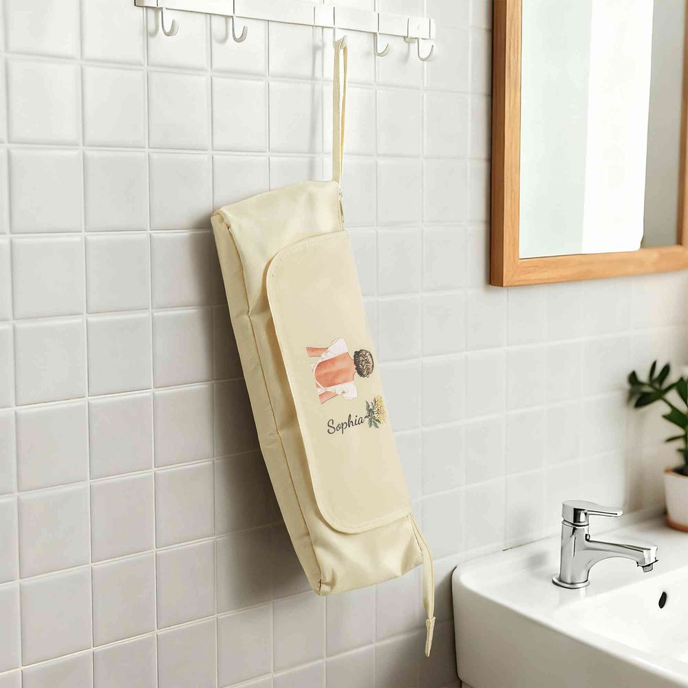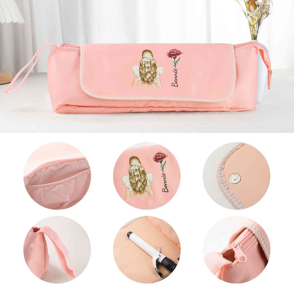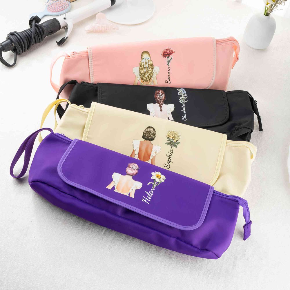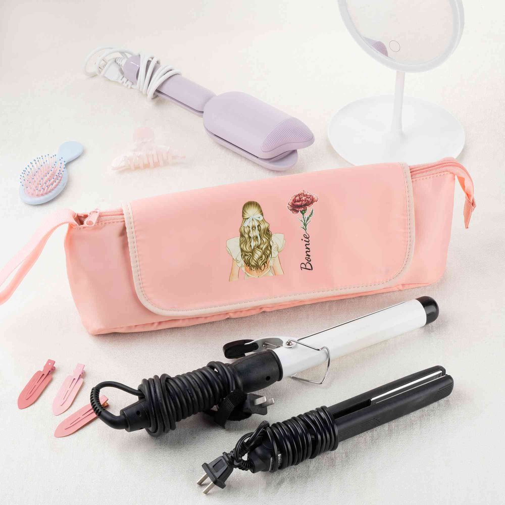 This hair styling tool pouch features an elegant and beautiful cartoon girl silhouette and birthday flower elements. The girl's smooth, shiny hair echoes the hair styling theme, and the personalized name design adds a unique touch.