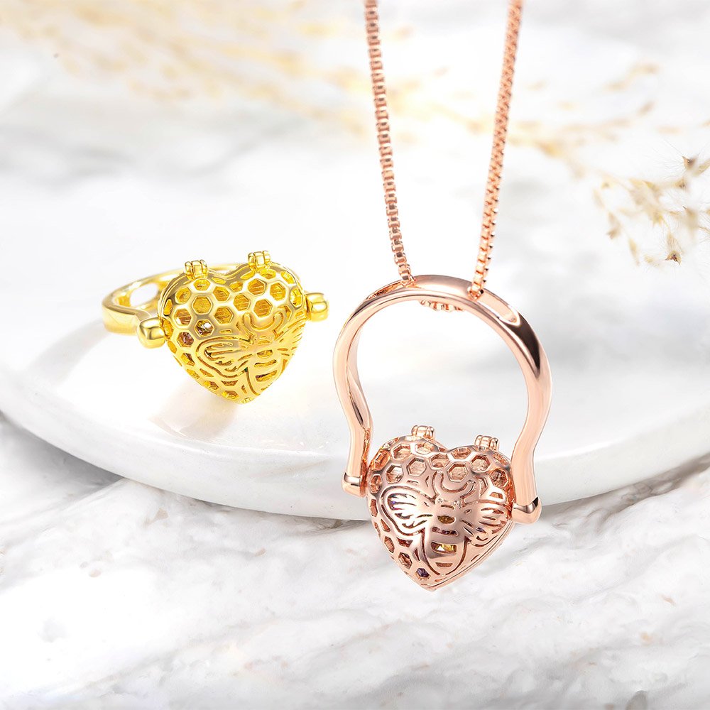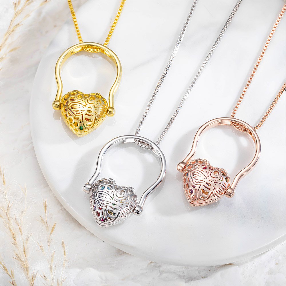 This is a necklace with a unique honeycomb heart design. It can be worn as a ring alone. You can customize the birthstone, photo, and special text or name to add personal style and express love to your beloved ones.
