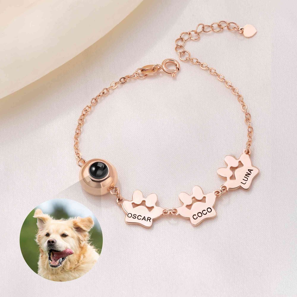 This personalized bracelet is a joyful celebration of the bond you share with your pet. The charming paw print can be engraved with your pet's name, showing its unique charm. Its standout feature is its photo projection feature, incorporating a precious photo into the bracelet through micro-engraving technology, allowing the wearer to recall special moments at any time.