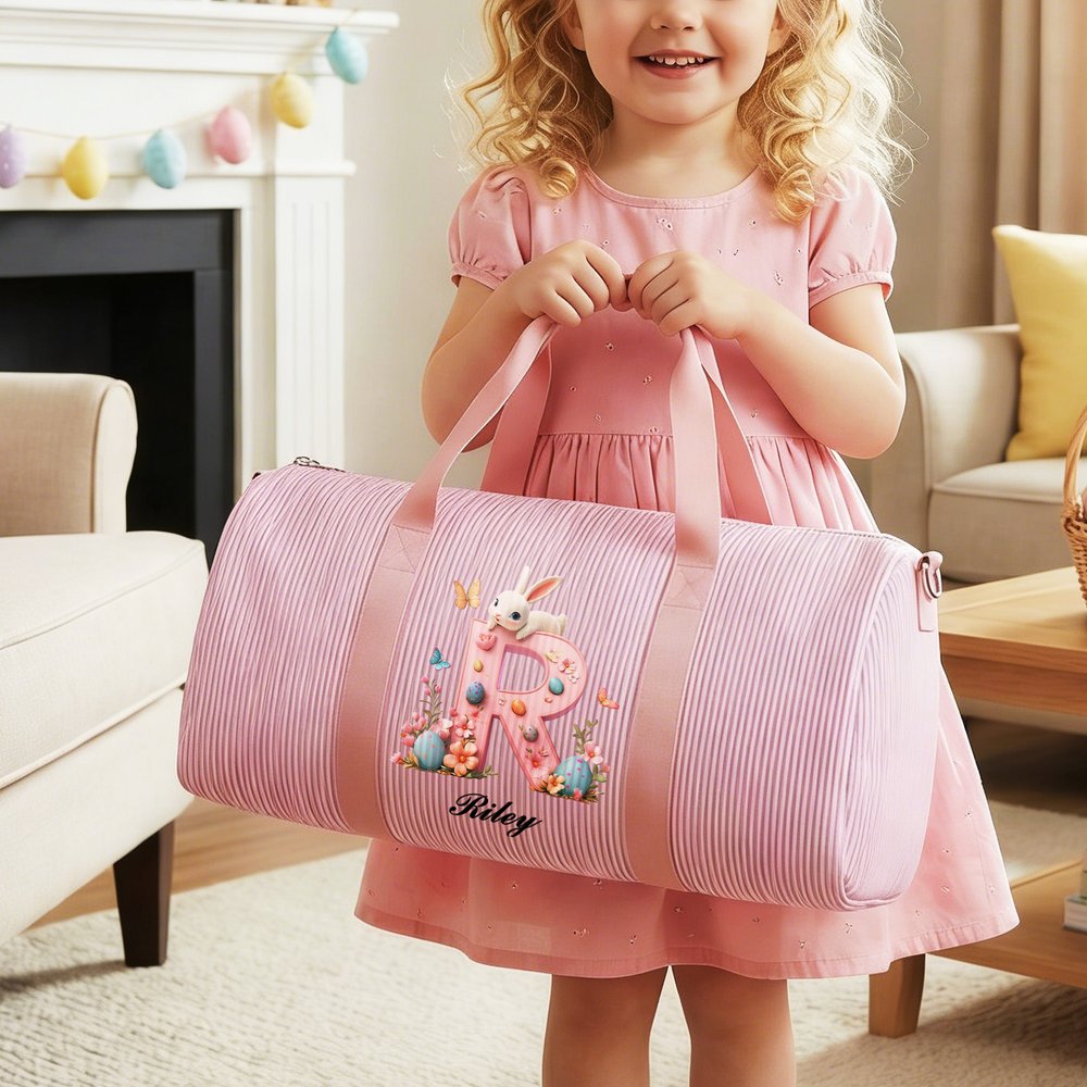Its striped canvas base features a 3D-style letter adorned with an Easter bunny, colorful eggs, and flowers, paired with the child’s name. The matching ribbon handle adds a polished touch, blending Easter joy with personalized charm to create a bag that’s both functional and full of festive spirit.